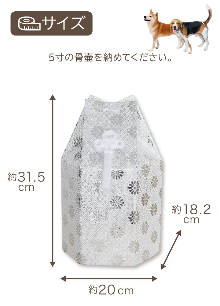 5寸サイズ(目安:中型犬)の骨壷と骨袋のセット。ペット霊園でも使用されている上質な白並骨壷と骨壷カバーをセットにしてお届けします。
