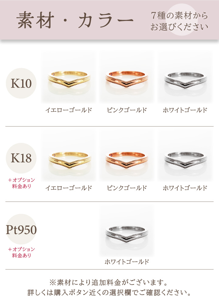 K10(イエローゴールド) K10(ピンクゴールド) K10(ホワイトゴールド)※ プラチナ950 K18(イエローゴールド) K18(ピンクゴールド) K18(ホワイトゴールド)※ ※=地金に対し銀白色のロジウムメッキを施したものになります。 プラチナ950はホワイトゴールドカラーのみ。ルテニウム(低アレルギー性金属)を2%配合し硬度を高めたプラチナ金属です。 |