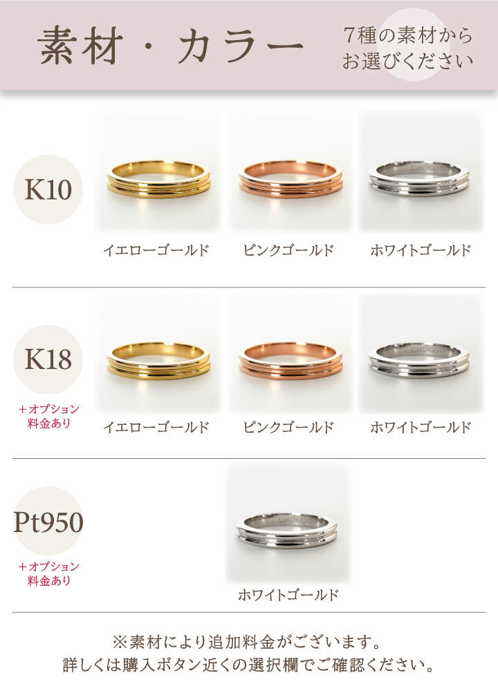 K10(イエローゴールド) K10(ピンクゴールド) K10(ホワイトゴールド)※ プラチナ950 K18(イエローゴールド) K18(ピンクゴールド) K18(ホワイトゴールド)※ ※=地金に対し銀白色のロジウムメッキを施したものになります。 プラチナ950はホワイトゴールドカラーのみ。ルテニウム(低アレルギー性金属)を2%配合し硬度を高めたプラチナ金属です。 |