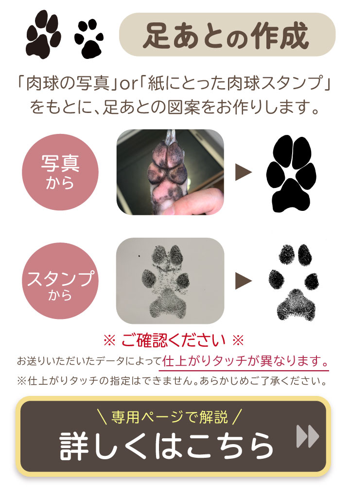 1.ご注文完了後、必要事項をメールでお送りください。 ●必要事項: 1)ご注文者様のお名前(わかれば注文番号) 2)ペットちゃんのお名前 3)ペットちゃんのお写真、足あとお写真の添付 4)その他(お写真のレイアウトについて、何かご要望がある場合) ※ペットちゃんのお耳や手足が切れていない全身しっかり入ったお写真をお選びください。 ※なるべく鮮明で、ペットちゃんが大きく写っているお写真をお選びください。 ※お打ち合わせ途中でのお写真の変更はできません。 ※ご法要でお急ぎの方、お写真についてご要望がある方は、上記お送り頂く際にお書き添えください。 ●お送り先● メールの場合:order@dearpet.jp LINEの場合:@583ryfhv で友達検索 足あとお写真については別ページで採り方を案内しています。 ↓ 2.イメージ原稿をお作りいたしますのでご確認ください。 ・イメージ原稿はお間違えがないかを確認いただくものです。お名前や数字などの内容に誤りがないか必ずよくご確認ください。 ・修正は2回まででお願いをしております(お写真自体のご変更はお受けできません)。 ↓ 3.承認の連絡後、製作開始 ・お送りした原稿でよろしければ、承認のご連絡をお願いします。 ご承認いただけない場合は製作できませんので、必ずご連絡ください。 ↓ 4.お届け 約2週間でお届けいたします。 |