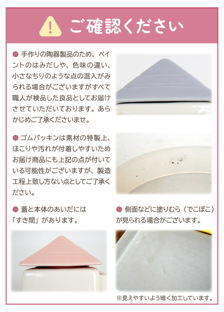 ・手作りの陶器製品のため、ペイントのはみだしや、色味の違い、小さなちりのような点の混入がみられる場合がございますがすべて職人が検品した良品としてお届けさせていただいております。あらかじめご了承くださいませ。