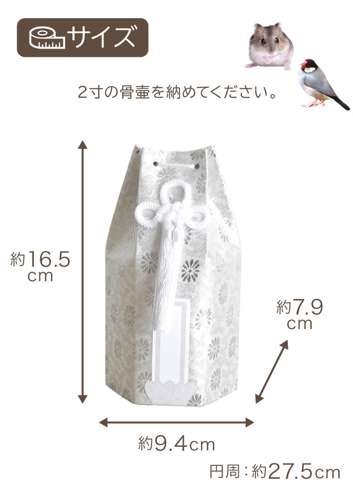 横幅 約9.4cm×高さ 約16.5cm×奥行き 約7.9cm・円周 約27.5cm サイズ:2寸の骨壷が納まるサイズです。 ○2寸骨壷サイズの目安:直径約6cm、高さ7.5cm お手元に骨壷がある場合には、覆袋から出した状態でサイズを確認してください。 ※ペットちゃんの骨壷の詳しいサイズは【こちら】でご案内しています。 ※お名前シール付き。お写真入れは付属していません。 別売のかわいいお名前シールのご紹介ページはこちら |