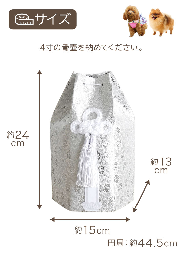 横幅 約15cm×高さ 約24cm×奥行き 約13cm・円周 約44.5cm サイズ:4寸の骨壷が納まるサイズです。 ○4寸骨壷サイズの目安:直径12×高14.5cm お手元に骨壷がある場合には、覆袋から出した状態でサイズを確認してください。 ※ペットちゃんの骨壷の詳しいサイズは【こちら】でご案内しています。 ※お名前シール付き。お写真入れは付属していません。 別売のかわいいお名前シールのご紹介ページはこちら |