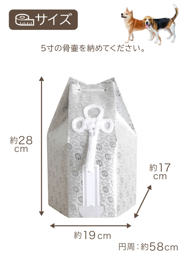 骨壷:5寸 直径15×高18.5cm 骨袋:横幅 約19cm×高さ 約28cm×奥行き 約17cm・円周 約58cm お手元に骨壷がある場合には、覆袋から出した状態でサイズを確認してください。 ※ペットちゃんの骨壷の詳しいサイズは【こちら】でご案内しています。 ※お名前シール付き。お写真入れは付属していません。 別売のかわいいお名前シールのご紹介ページはこちら |
