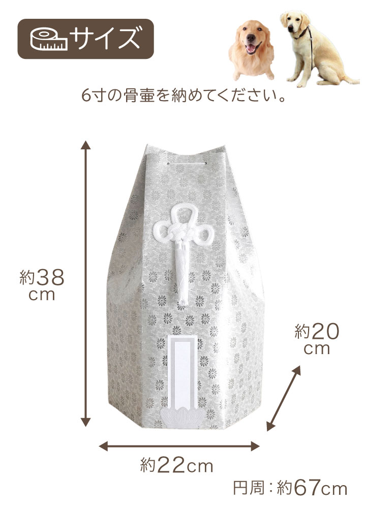 横幅 約22cm×高さ 約38cm×奥行き 約20cm・円周 約67cm サイズ:6寸の骨壷が納まるサイズです。 ○6寸骨壷サイズの目安:直径21×高25.5cm お手元に骨壷がある場合には、覆袋から出した状態でサイズを確認してください。 ※ペットちゃんの骨壷の詳しいサイズは【こちら】でご案内しています。 ※お名前シール付き。お写真入れは付属していません。 別売のかわいいお名前シールのご紹介ページはこちら |