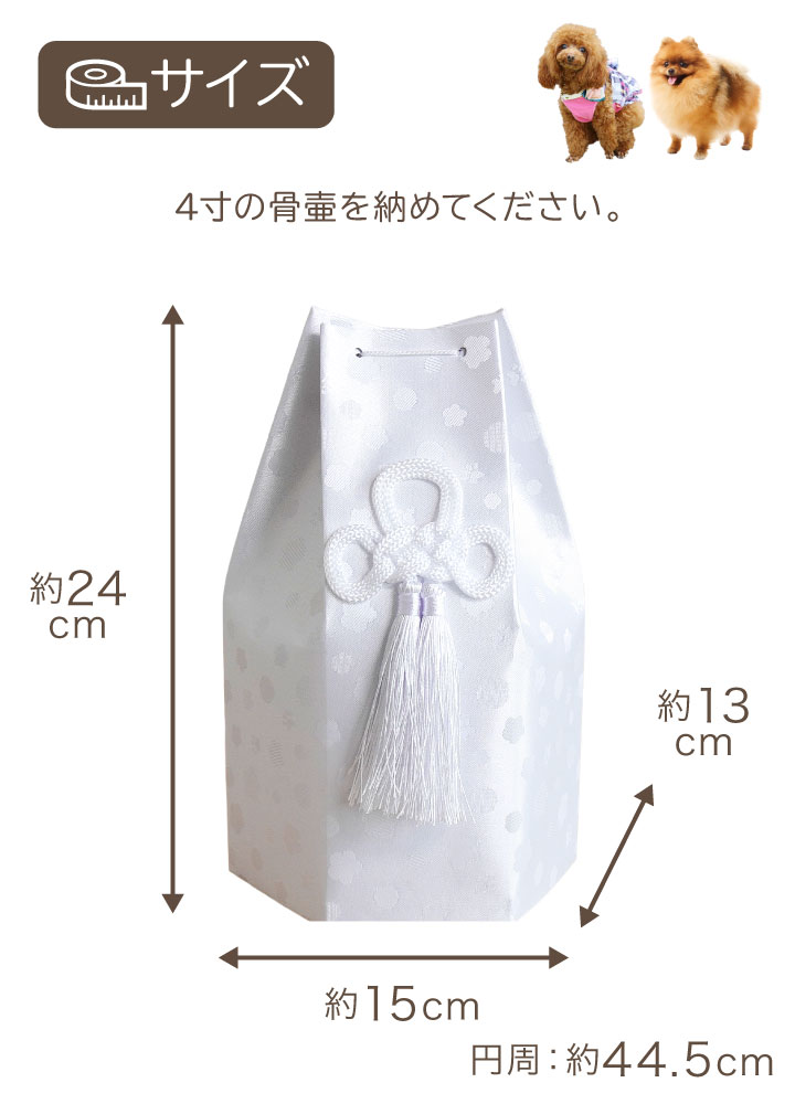 骨壷:4寸 直径12×高14.5cm 骨袋:横幅 約15cm×高さ 約24cm×奥行き 約13cm・円周 約44.5cm お手元に骨壷がある場合には、覆袋から出した状態でサイズを確認してください。 ※ペットちゃんの骨壷の詳しいサイズは【こちら】でご案内しています。 ※お名前シール、お写真入れは付属していません。 (別売)お名前シールのご紹介ページはこちら |