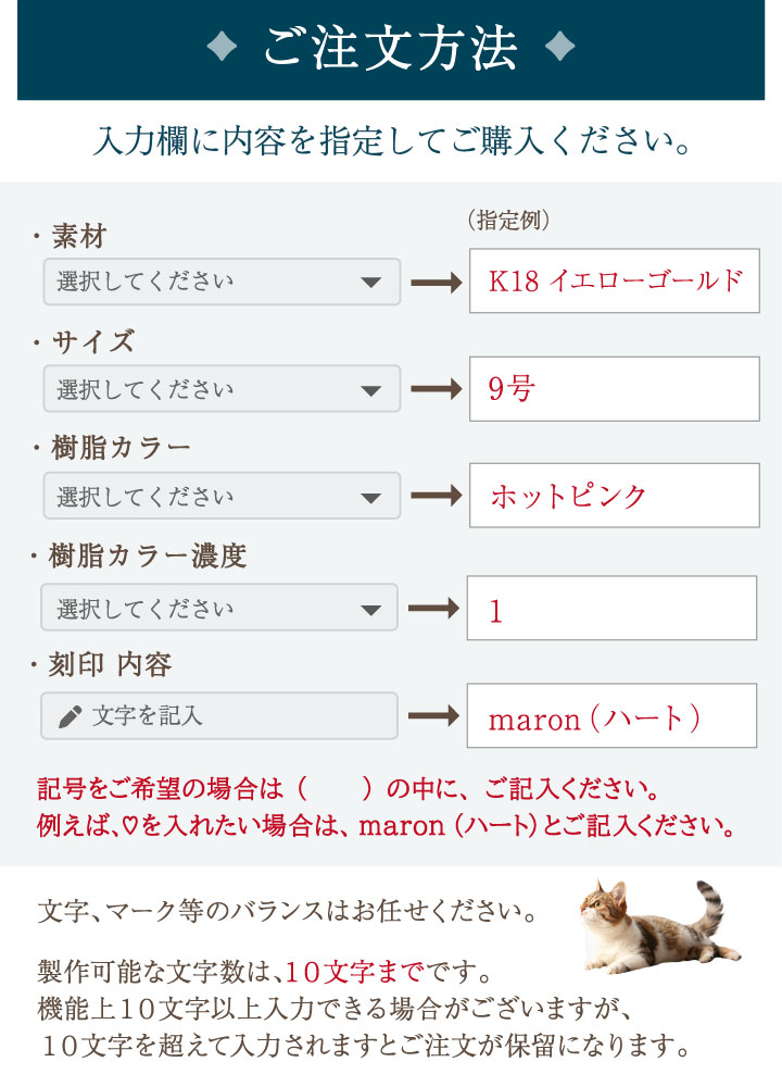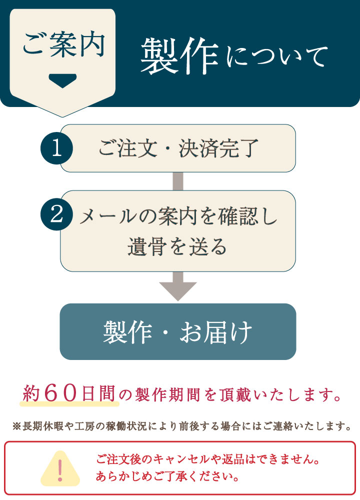 1.希望内容を「買い物かごに入れる」ボタンのそばの選択欄にてご指定ください。 ※お入れできる文字について: ・英数字のみ(ひらがな、カタカナ、漢字など、ページ内の字体見本にない文字はお使いいただけません) ・文字数は10文字までです。機能上10文字以上入力できる場合がございますが、10文字を超えて入力されますとご注文が保留になります。 ※記入漏れや不明瞭点がある場合は、いったん保留となります。 ※ご不明点ございましたらご注文前に048-661-2100までお電話ください。 ※ご注文後はすぐにご製作へと移りますため、ご変更やキャンセルをお受けできません。よくご確認の上、お手続きください。 ↓ 2.内容確認後、デザイナー・職人が心を込めて制作いたします。 ※お送りいただいた内容に問題がない限り、完成までの事前確認はございません。 ↓ 3.お届け 必要事項の受領から、約60日前後で完成・発送いたします。 |