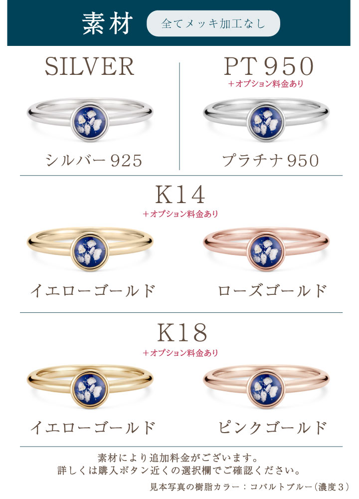 下記の中からお好みの種類をお選びいただけます。 シルバー925 プラチナ950 K14(ローズゴールド/イエローゴールド) K18(ピンクゴールド/イエローゴールド) ※素材により金額が異なります。ご注意ください。 |