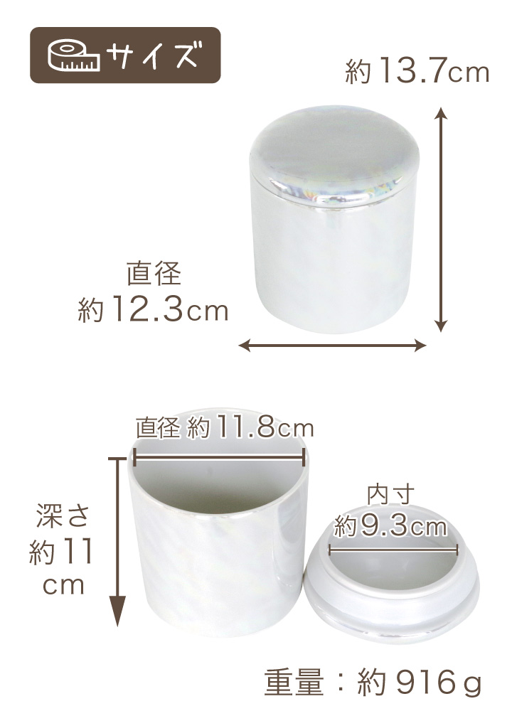 外寸 高さ 約13.7cm×直径 約12.3cm 内寸 深さ 約11cm×直径 約11.8cm 蓋の内寸 直径約9.3cm 重量 約916g |