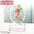 | この位牌に決めて正解でした。 おりんの金色、骨袋の金糸、ろうそくの灯火、一輪挿しの花弁など、宝石の様なカットが施された位牌が周りの光を受けて多角的に輝いて見え、とても綺麗です。 ディアペット様が、クリスタルガラスにこだわる理由、そして精度の高いカットにこだわる理由がまさにこれかと、いろんな角度からまじまじと見ながら納得しました。 そんなクリスタルガラス位牌の種類がたくさんある中で、個人的な選考点は以下の2点です。 ・クリスタルガラスの透明感を通して写真があってほしかったので“背面がフラットで、背面からプリントされるもの”です。 自分にとっては、これは大正解で、実際に手元供養の祭壇に置き、ろうそくを灯し、香を手向け、りんを鳴らし、手を合わせると、位牌を斜め上から見下ろす形になり、写真のプリントが多角形に乱反射して見え、華やかです。 ・次に、あくまで個人的な好みですが“台座一体型で、背が高く行儀がいいデザインのもの”です。 これも大正解で、手のひらに収まるスケールながら、祭壇の中心たりえる重量と品があり、日々のお供えとお祈りをする手元供養の立派な顔になりました。 そして、これは図らずとも偶然の一致でしたが、あらかじめ選んだ位牌用の写真は、緑が豊かなハイキングスポットでの一枚で、位牌の固定デザインであるクローバーの緑と、イメージがぴったり合うと感じました。 尚、これは全ての種類のメモリアルグッズに言えることですが、フォントは、視認性を優先するなら、かわいさよりも、太さで選んだほうがいいかもしれません。 打ち合わせのメールで頂いたイメージ画像を見た時や、実際に手に取った近さで見た時と、祭壇に置き正座した高さからの距離で見た時で、当然違ってきますので、離れても文字がクッキリ見えたほうがいいか、文字は控えめな印象がいいかをふまえてフォントを選ぶとよいかもしれません。 長くなりましたが、最後に、お急ぎ納期への迅速な対応、制作から発送まで、注文してから手元に届くまで、そして届いた後までもの一連の業務を、的確にスピード感を持って取り組んでいただきましたことと、丁寧な、心の籠った梱包や、虹の橋のお守りのサプライズ、手書きのメッセージが添えられたご案内の用紙など、ディアペット様一同の心意気に励まされ、助けられ、感動いたしましたことを付け加えて以上とさせていただきます。 |