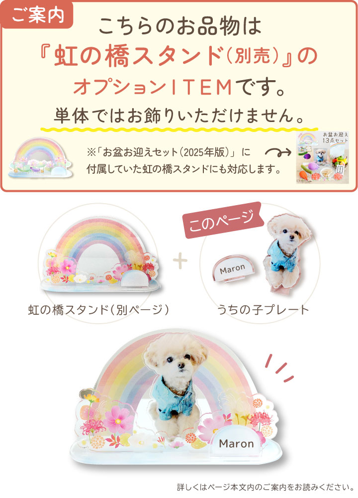 ~虹の橋スタンドシリーズ~![]() 虹の橋スタンド+うちの子プレート+きせかえパーツ | ||