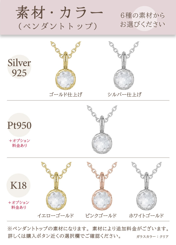 [トップ] シルバー925(シルバー仕上げ)※ シルバー925(ゴールド仕上げ)☆ シルバー925(ピンク仕上げ)☆ プラチナ950※ K18(ホワイトゴールド)※ K18(イエローゴールド) K18(ピンクゴールド) [チェーン] ホワイトゴールド※、イエローゴールド☆、ピンクゴールド☆ →チェーンはトップのカラーに合わせてお届けします。 →全てシルバー925製です。トップの素材がシルバー925以外の場合は、若干色味が異なります。あらかじめご了承ください。 ※マークの3種は、地金に対し銀白色のロジウムメッキを施したものになります。 ☆マークは、地金に対し金メッキを施したものになります。 |