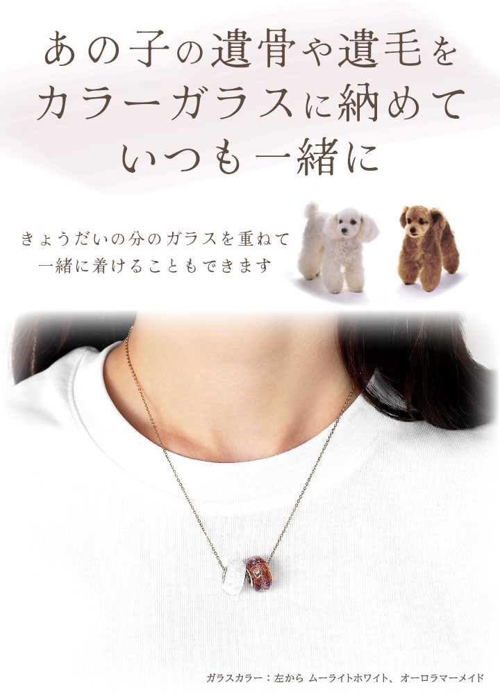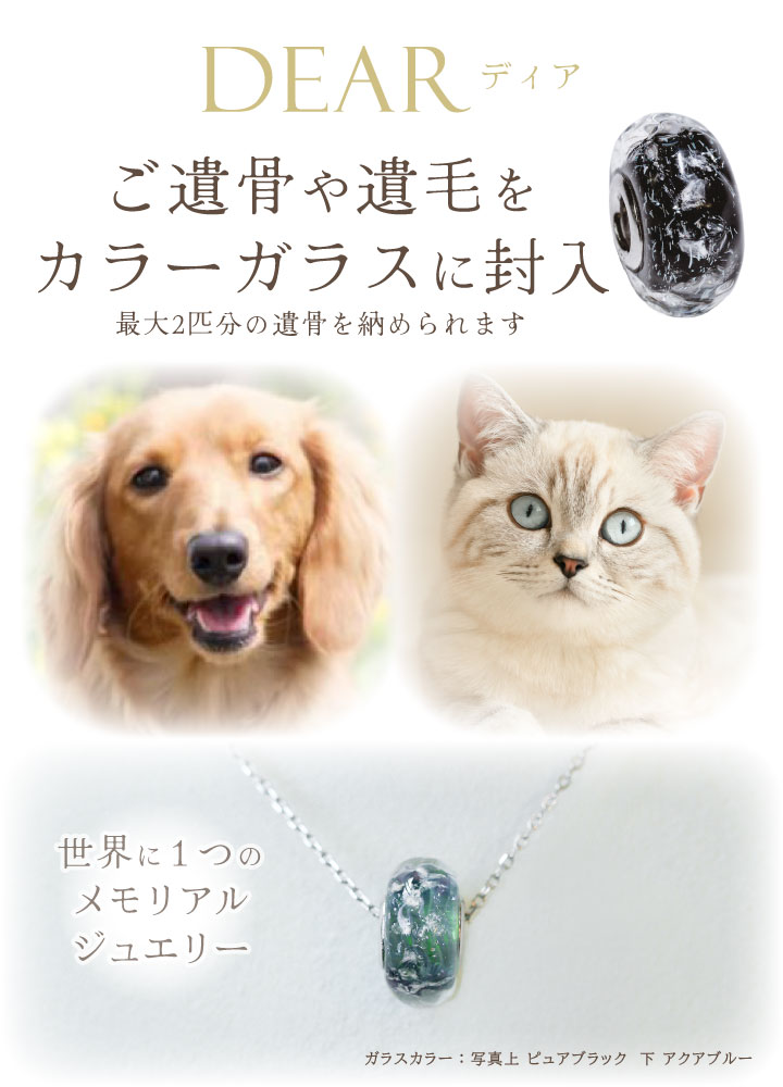 ペットちゃんの大事な遺骨や遺毛を、美しいカラーガラスで包み込んでおつくりするオーダージュエリーです。