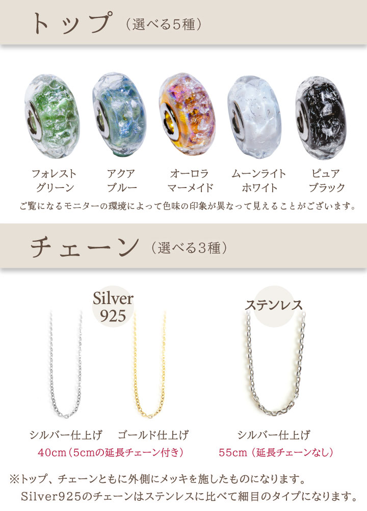 [トップ] 金具素材:シルバー925 [チェーン] シルバー925(シルバー仕上げ)※ シルバー925(ゴールド仕上げ)☆ ステンレス(シルバー仕上げ)※ ※マークは、地金に対し銀白色のロジウムメッキを施したものになります。 ☆マークは、地金に対し金メッキを施したものになります。 |
