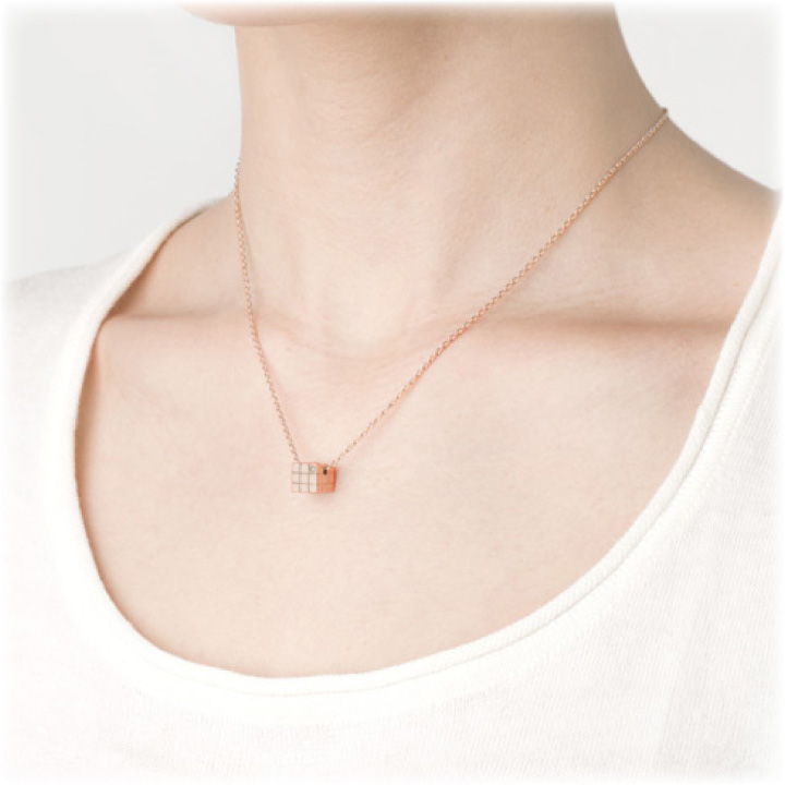繊細な正方形に輝く一粒ダイヤモンドをあしらったシンプルなデザインが特徴です。